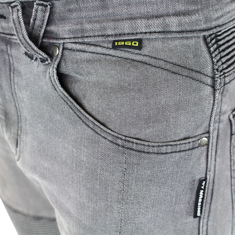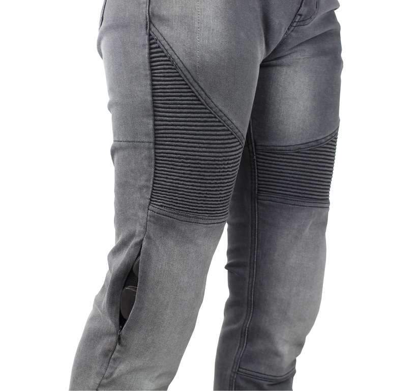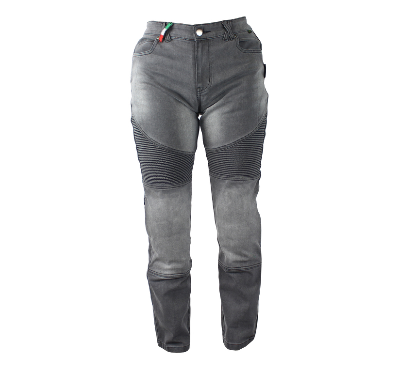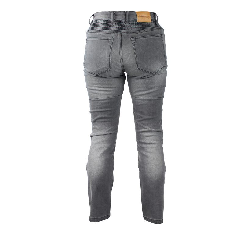 Dámské denim kalhoty na motorku, certifikované s vyjímatelnými chrániči boků a kolen, vyztužené kevlarem. Elastické oblasti na bedrech a kolenech.
