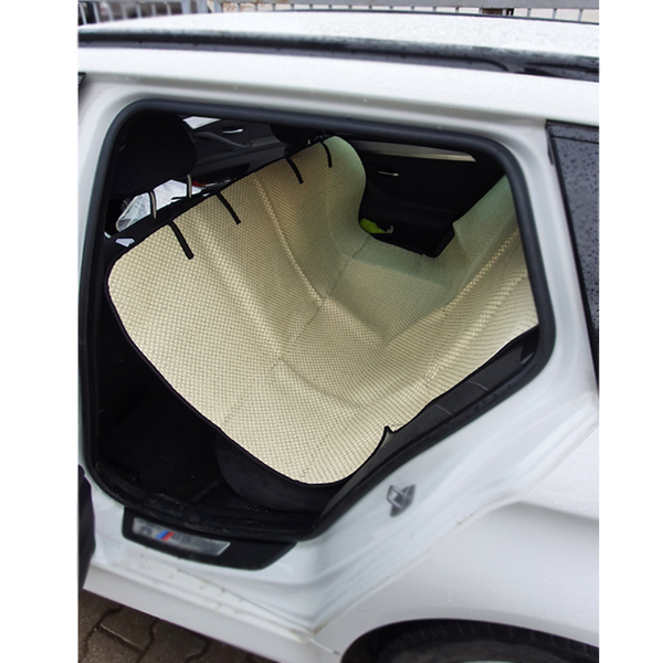 For easy assembly, the pads have laces with plastic buckles sewn onto the pads, which attach to the headrests and the blanket snaps off according to the shape of the seats. A similar procedure is followed for fitting in the boot, where one side of the pad is reattached to the rear head restraints and the pad is switched off according to the shape of the boot space.