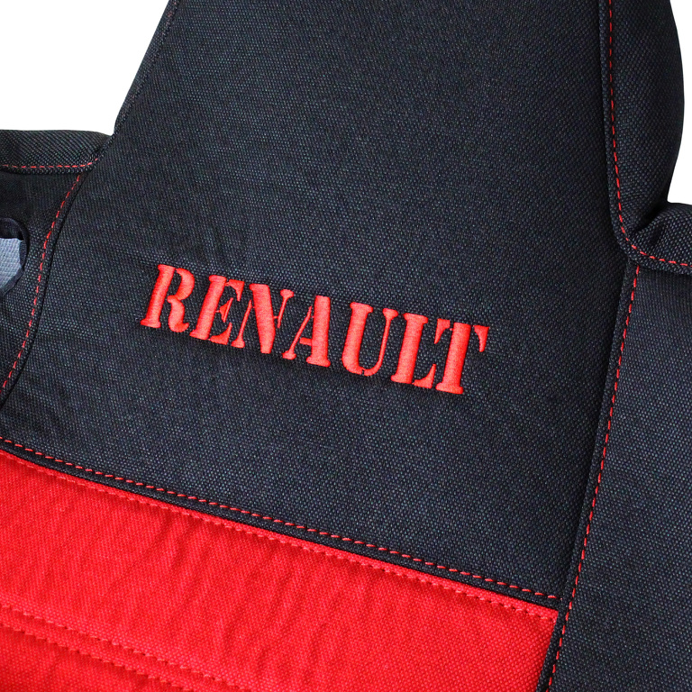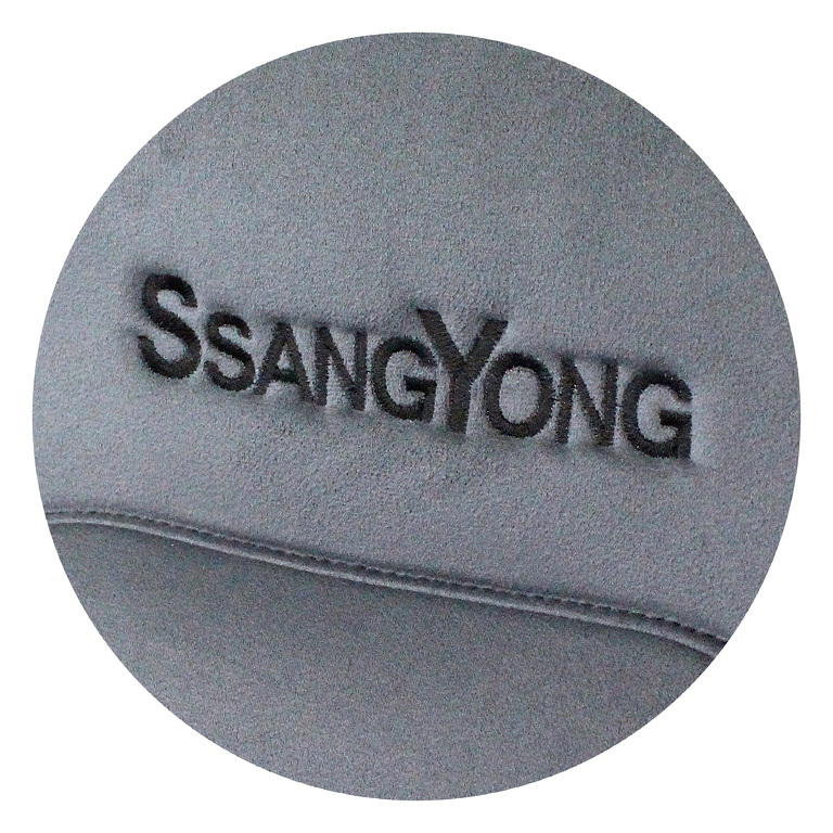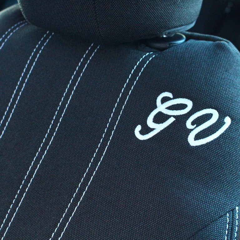 Custom embroidery for the front parts of our seat covers. We are able to embroider basically any text or logo up to rougly 13 x 6 cm.