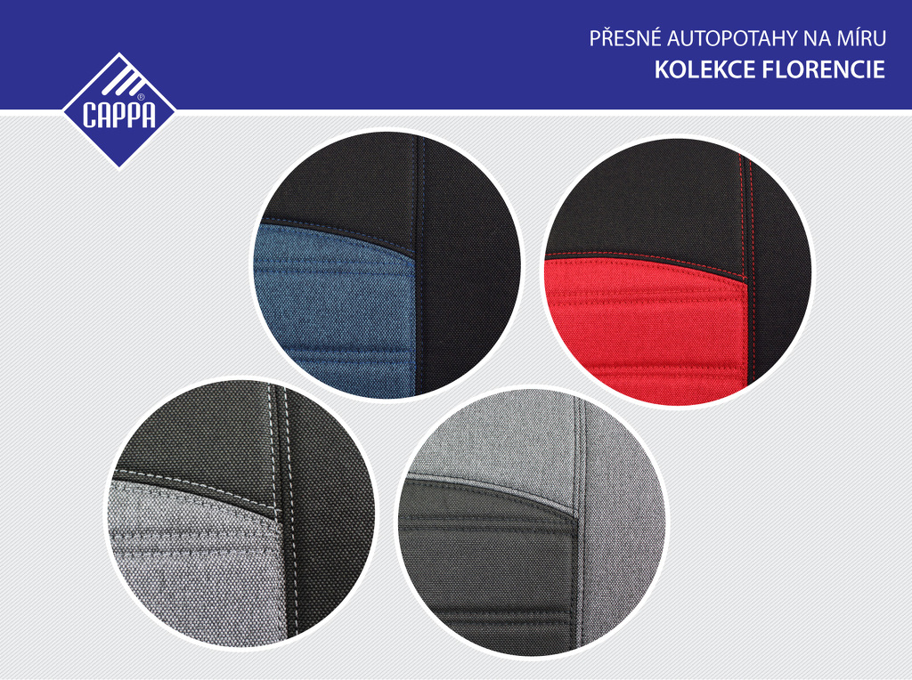 Florencie je vrcholem kolekcí autopotahů na míru Cappa. Základním materiálem je prošívaná čalounická látka Fiesta s výbornou odolností. Pokud preferujete eko-kůži nebo materiál Alcantara, doporučujeme například kolekci Vittoria.