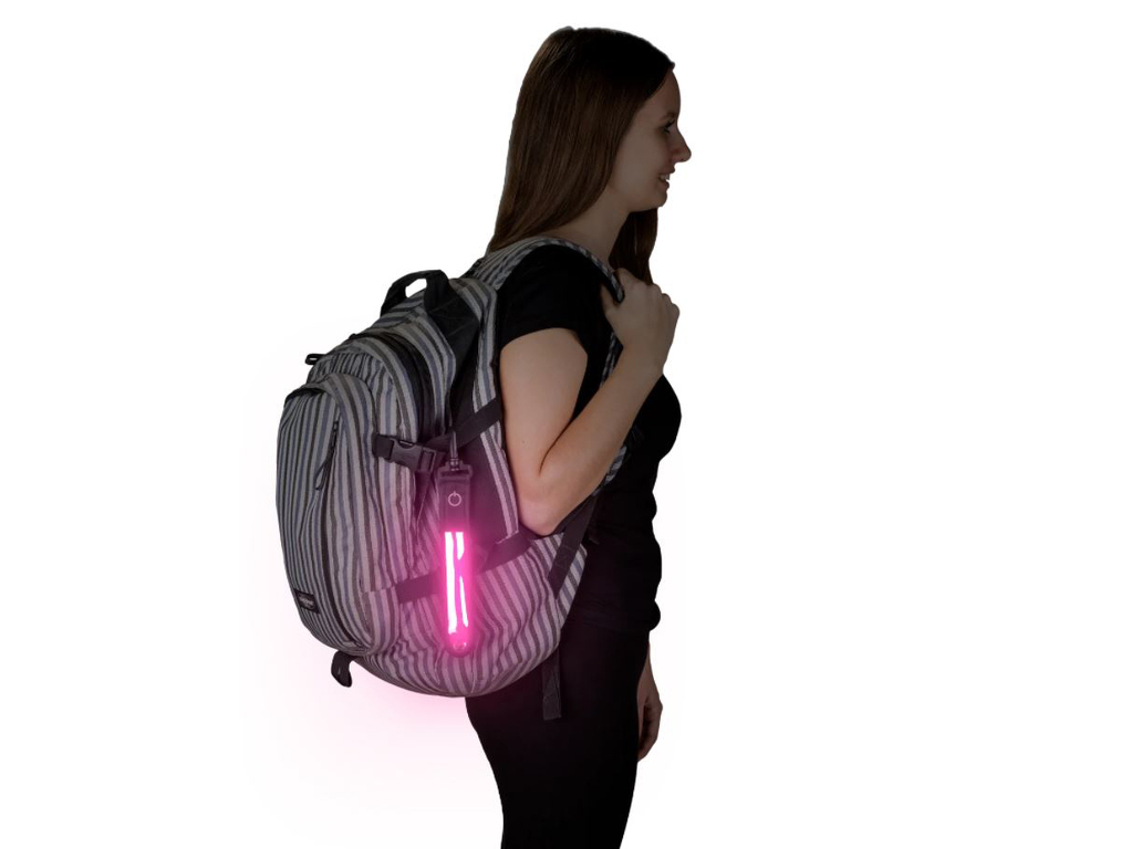 Růžový reflexní přívěsek s LED podsvícením. Skvělý pro zvýšení viditelnosti za snížené viditelnosti. Zároveň může sloužit jako nouzová svítilna.
