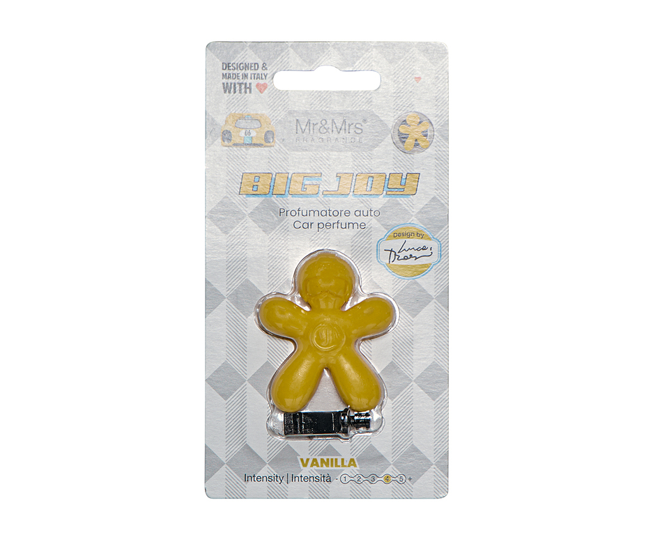 Big Joy je osviežovač vzduchu do auta, ktorý navrhol Luca Trazzi v športovom, popovom a farebnom duchu. Je vyrobený z EVA - termoplastického polyméru (mäkkej gumy) a pri kontakte so vzduchom vypúšťaným cez ventilačný otvor vozidla uvoľňuje príjemnú vôňu.