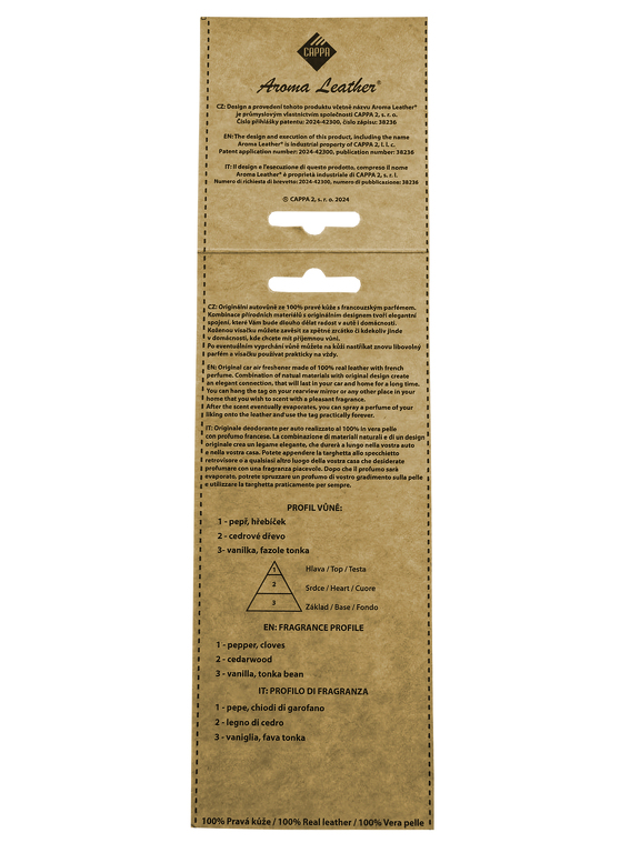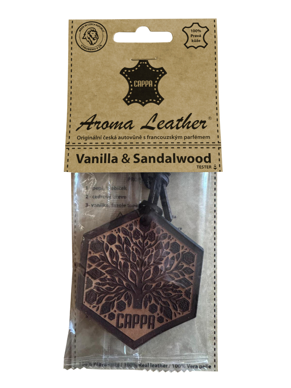 Aroma Leather Tree Vanilla & Sandalwood je exkluzivní vůně do auta vyrobená z pravé hovězí kůže. S francouzským parfémem (pepř, hřebíček, cedrové dřevo, vanilka, fazole tonka) je ideální pro auto i domácnost. Vyrobeno v České republice.