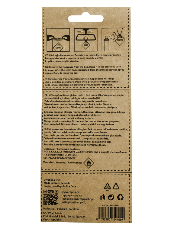 Vůně je napuštěna prémiovým francouzským parfémem, který příjemně provoní vaše auto, byt nebo kancelář. Díky své univerzálnosti ji můžete zavěsit kamkoliv, nebo ji umístit na jiné místo v interiéru. Po vyprchání původní vůně stačí na kůži nastříkat libovolný parfém a osvěžovač můžete používat znovu a znovu. Tento produkt nabízí praktické a dlouhotrvající řešení pro všechny, kteří si potrpí na kvalitu a design.