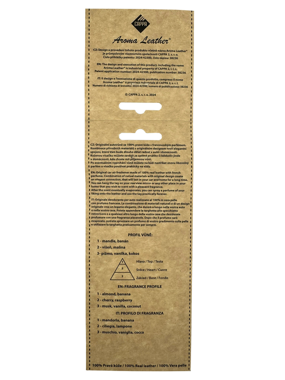 Přineste do svého automobilu nebo domácnosti nádech luxusu s naší originální vůní do auta Aroma Leather Cappa Cherry vyrobenou z pravé hovězí kůže. Tento designový osvěžovač je nejen účinný, ale také stylový doplněk, který zaujme každého, kdo hledá kvalitu a dlouhotrvající vůni.
