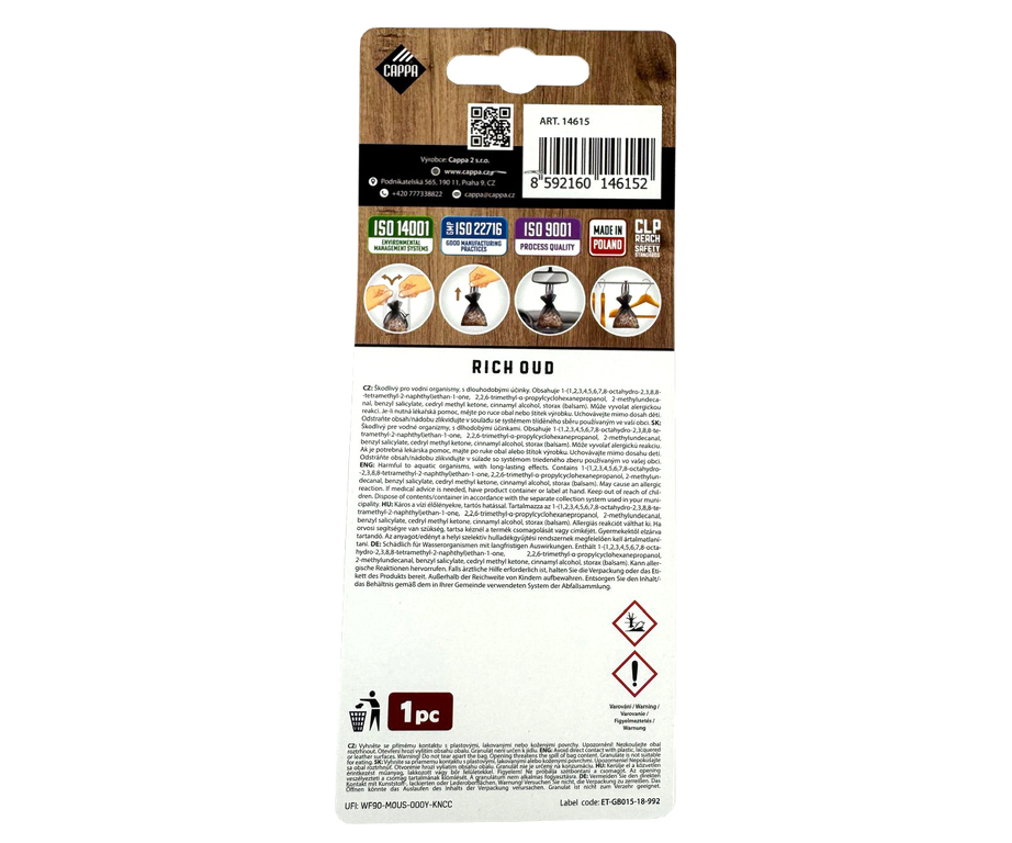 Vůně se uvolňuje skrze dřevěné třísky – zcela přírodní způsob šíření aroma, který zajistí rovnoměrné a plynulé provonění prostoru bez potřeby plastových nosičů. Skvěle se hodí do auta, šatníku nebo koupelny – všude tam, kde chcete navodit příjemnou a luxusní atmosféru.