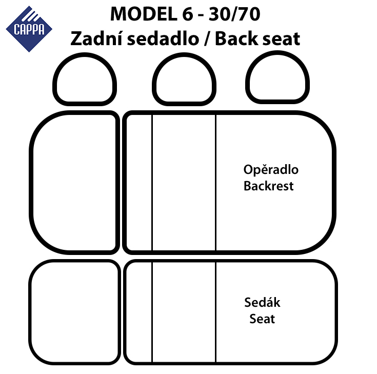 Zadní sedadla jsou dělena pro sklápění sedadel. Autopotahy jsou vhodné do vozidel s dělenými zadními sedadly v poměru 30/70 s menší částí za spolujezdcem.