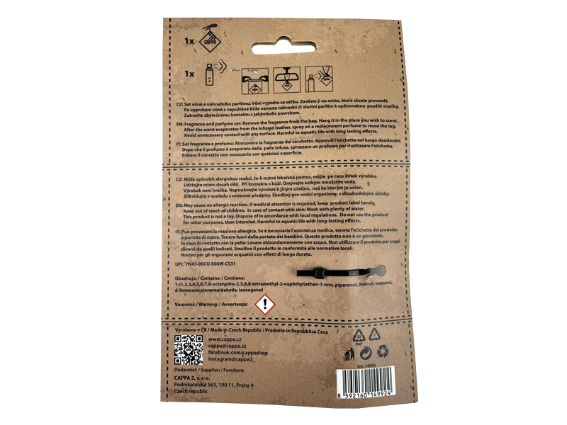 Vůně je napuštěna prémiovým francouzským parfémem, který příjemně provoní vaše auto, byt nebo kancelář. Díky své univerzálnosti ji můžete zavěsit kamkoliv, nebo ji umístit na jiné místo v interiéru. Po vyprchání původní vůně stačí na kůži nastříkat libovolný parfém a osvěžovač můžete používat znovu a znovu. Tento produkt nabízí praktické a dlouhotrvající řešení pro všechny, kteří si potrpí na kvalitu a design.