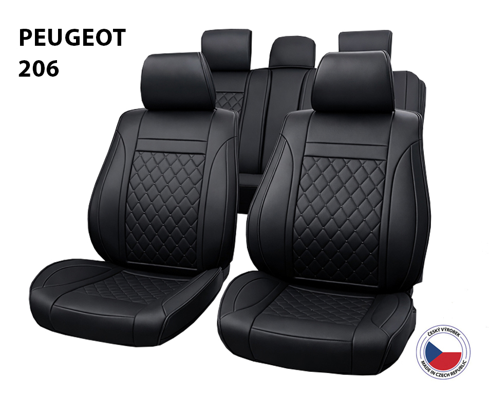 Autopotahy Perfetto pro Peugeot 206, semi-speciál. Eko kůže+ pěna (0,5cm), pro nedělená i dělitelná zadní sedadla. Včetně opěrek hlavy, homologováno pro boční airbagy. Vhodné pro zadní loketní opěrku a 3 bezp. pás.