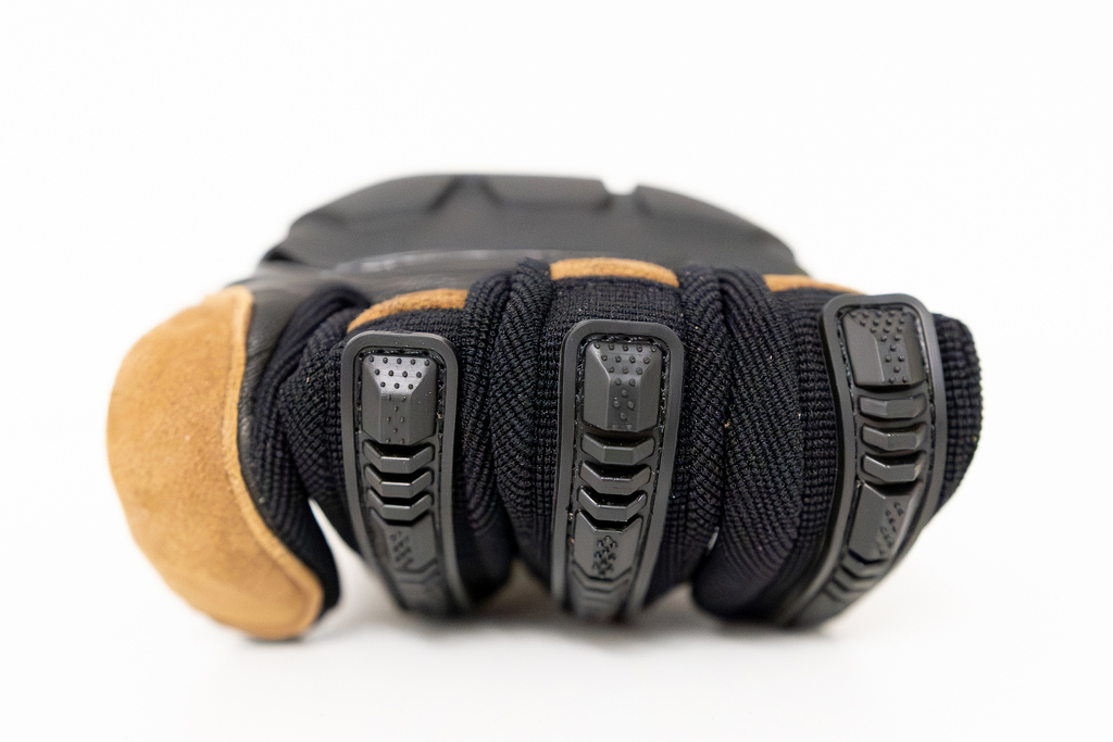 Rukavice jsou vyrobeny z kvalitní kůže (95%) a textilu (5%), což zajišťuje jejich dlouhou životnost a odolnost proti opotřebení. Kůže je nejen odolná, ale také dostatečně flexibilní, takže se rukavice snadno přizpůsobí vaší ruce. Polymerové chrániče na klíčových místech rukavic chrání před nárazy a zároveň neomezují pohyb.