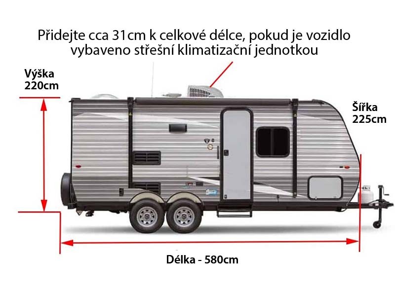2) Plachta 580×225×220 je vhodná pro menší až středně velké karavany s délkou obytné části cca 5,6–6,0 m a šířkou do 2,25 m, např.: