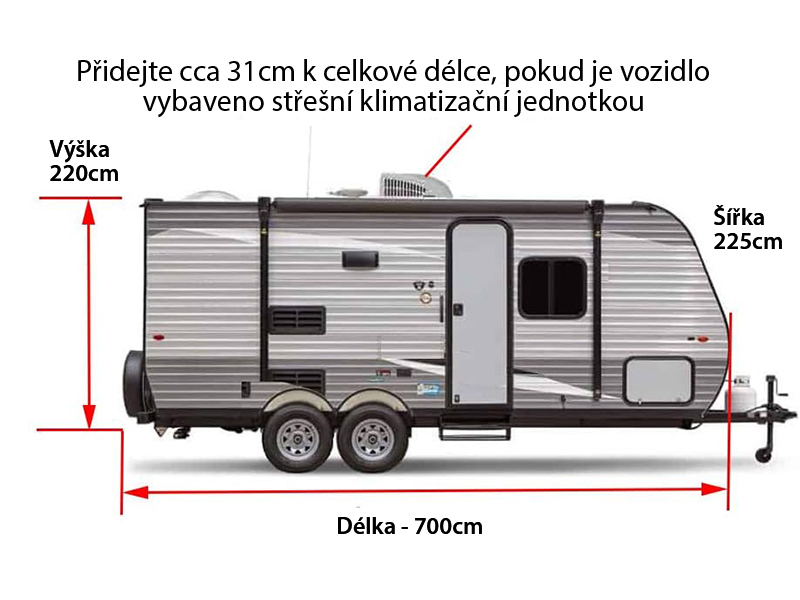 Plachta 700×225×220 je vhodná pro středně velké až větší karavany s délkou obytné části cca 6,8–7,3 m a šířkou do 2,25 m, např.: