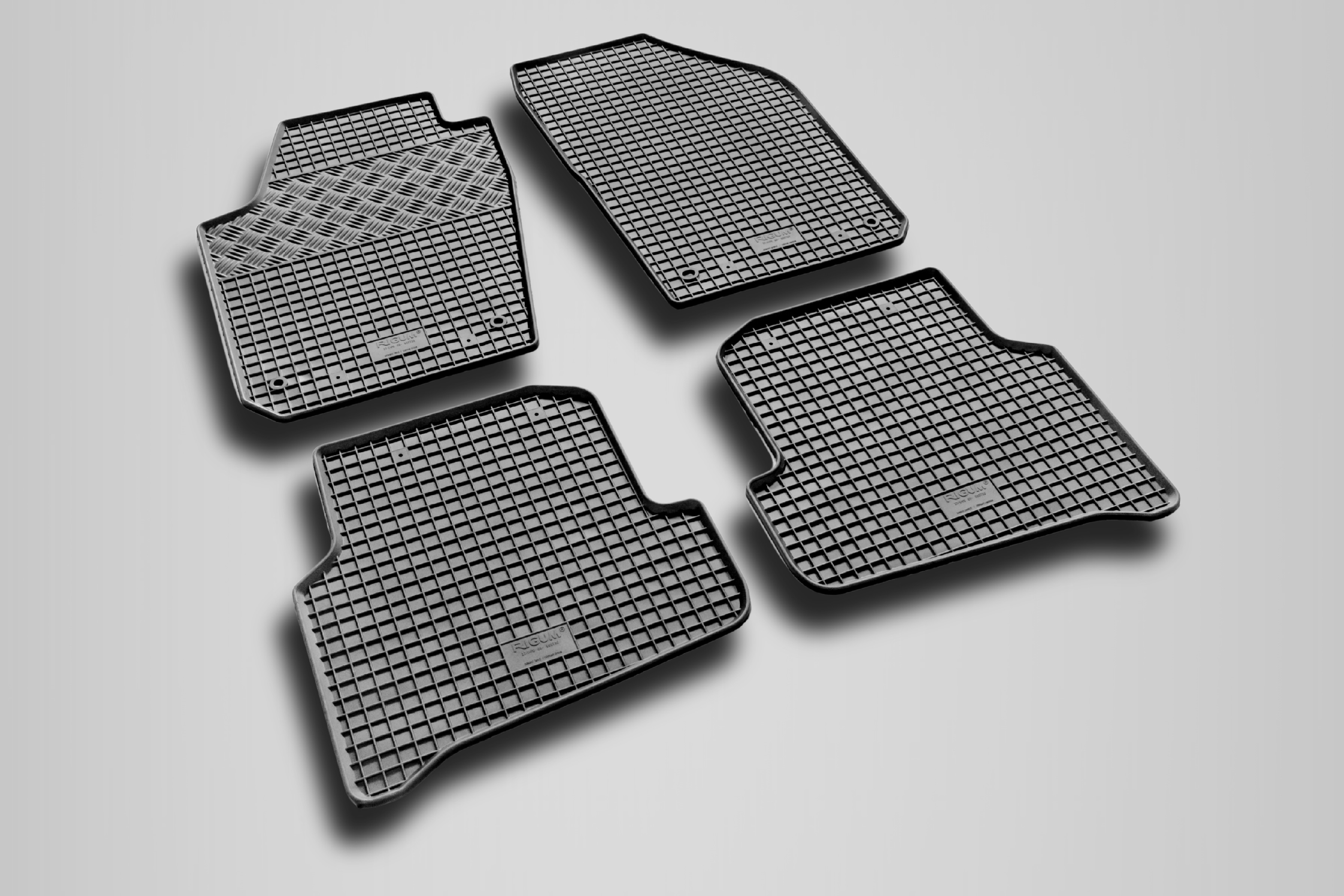 Sada (4 ks) přesně pasujících gumových koberců pro Škoda Fabia III 2014-2021. Praktický doplněk s cca 10 mm okrajem chránící podlahu Vašeho auta před vlhkostí a nečistotami v každém počasí.
