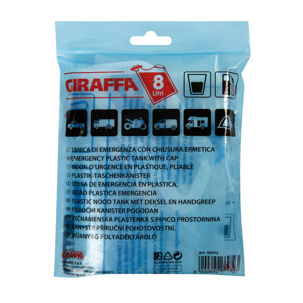 Nouzový kanystr GIRAFFA je vždy připraven k použití. Zabere minimum místa a může být skladován kdekoliv. Vhodný pro opakované použití. Snadno uzavíratelný díky klipu.