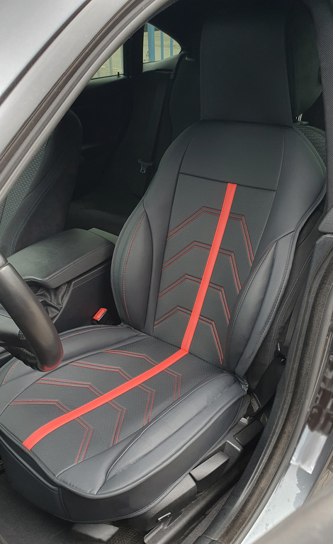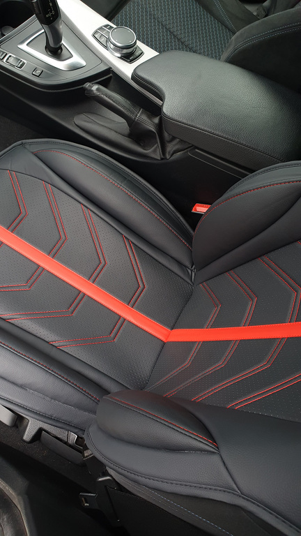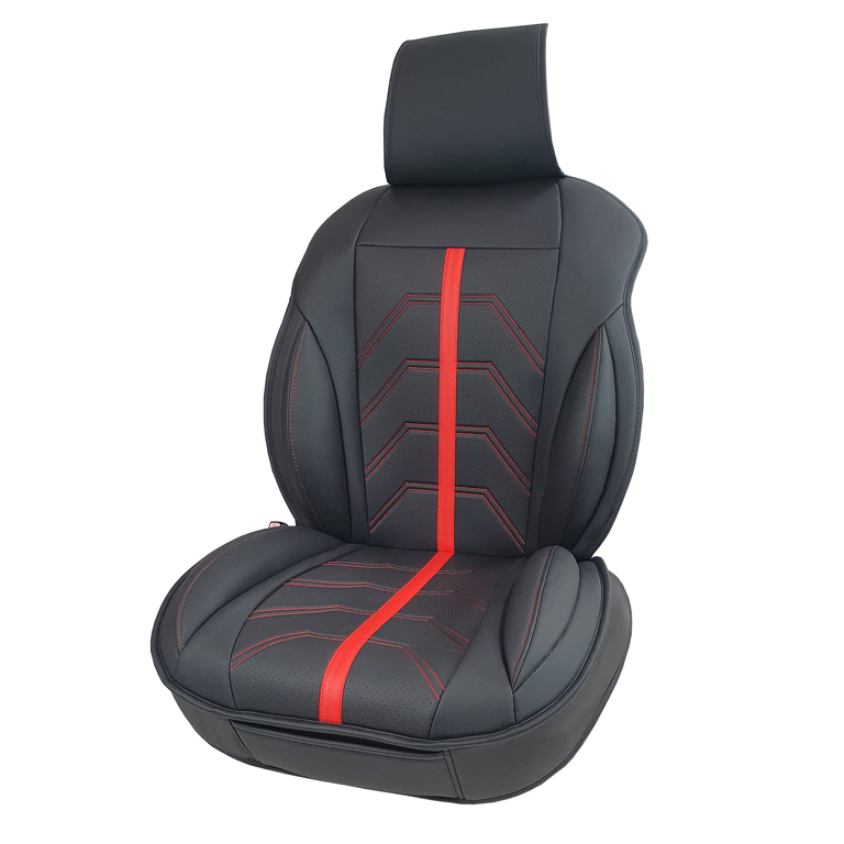 Univerzální sportovní přehoz na jedno sedadlo automobilu, 7 mm pěnové polstrování, integrovaný potah opěrky hlavy, kompatibilní s bočními airbagy a vyhřívanými sedačkami, prémiová perforovaná umělá kůže, přední kapsa na telefon, doklady atd.