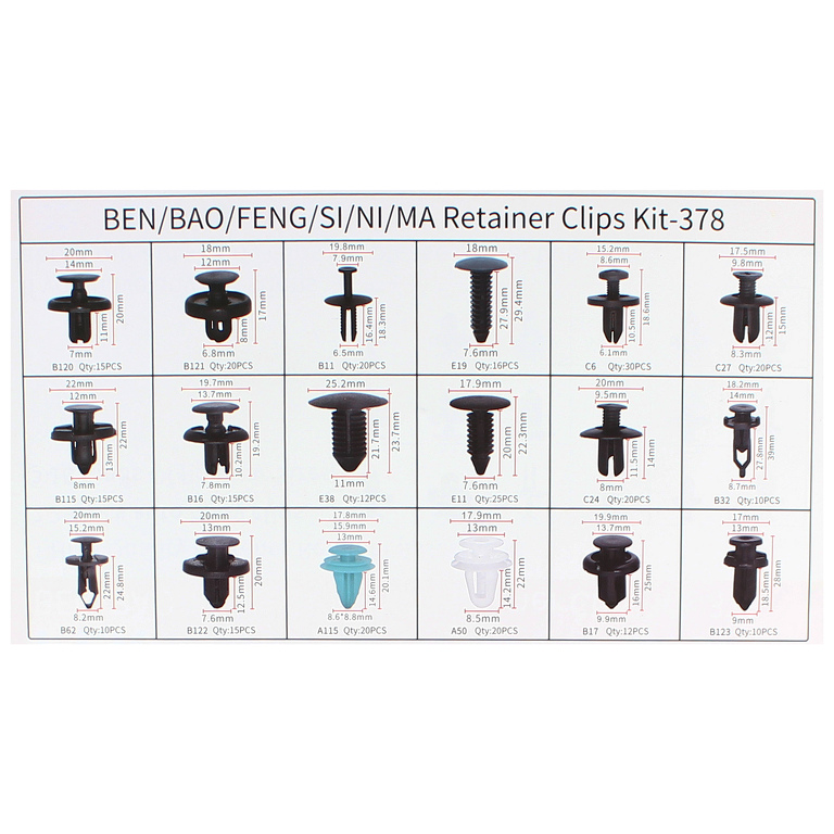 Sada plastových příchytek pro automobilové čalounění, plastové díly v motorovém prostoru, spodní kryty motoru, nárazníky, motocyklové kapotáže apod. Ideální jako náhrada při ztrátě či zničení původní příchytky.