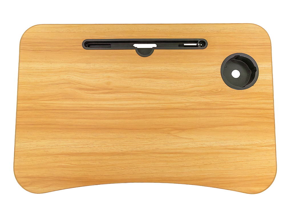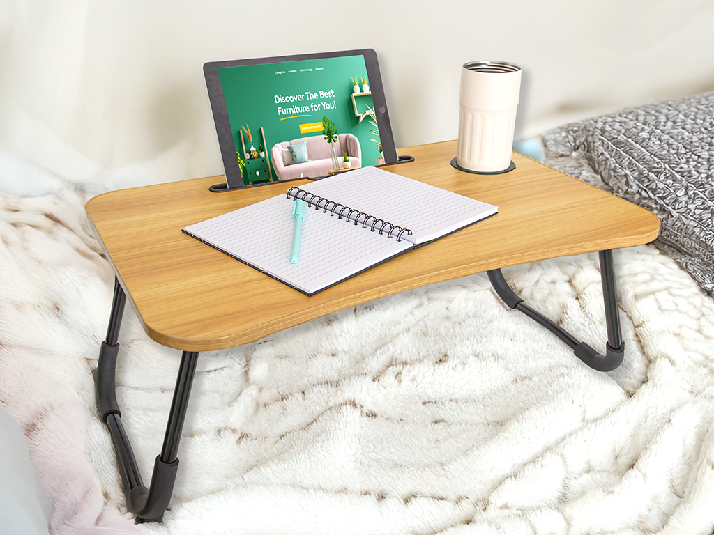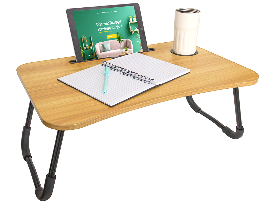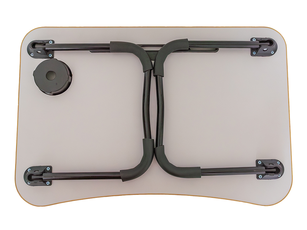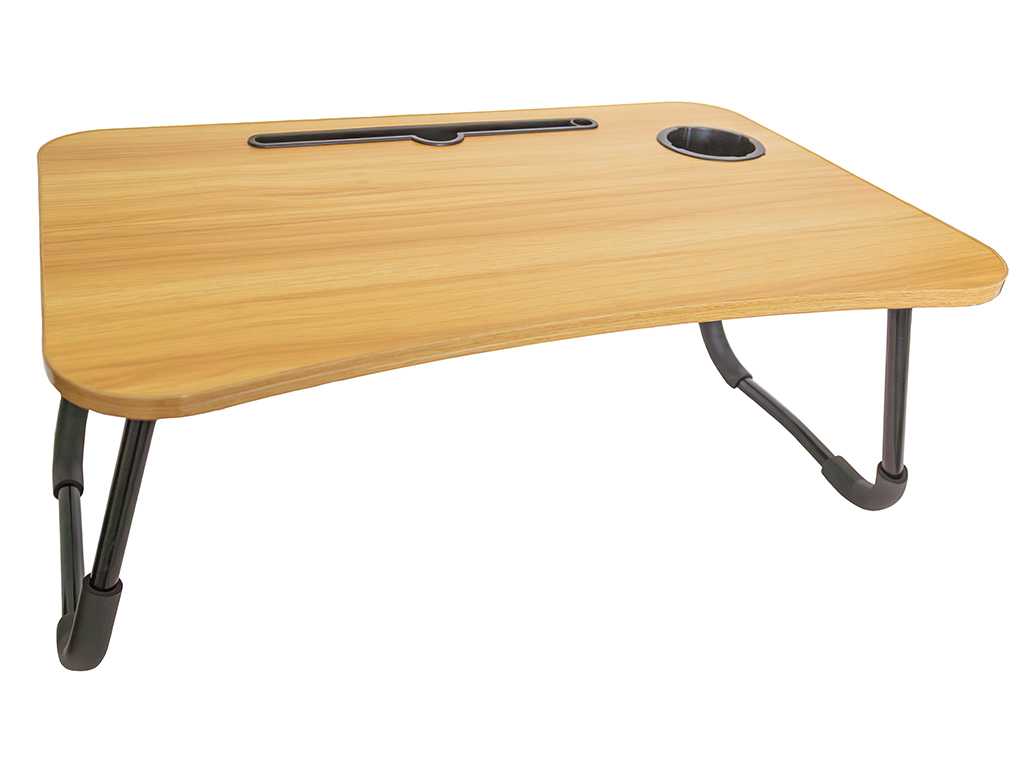 Praktický skládací stolek na notebook s pevnou MDF deskou, stabilním kovovým rámem a otvorem na nápoj. Lehký, skladný a ideální pro práci i zábavu doma.