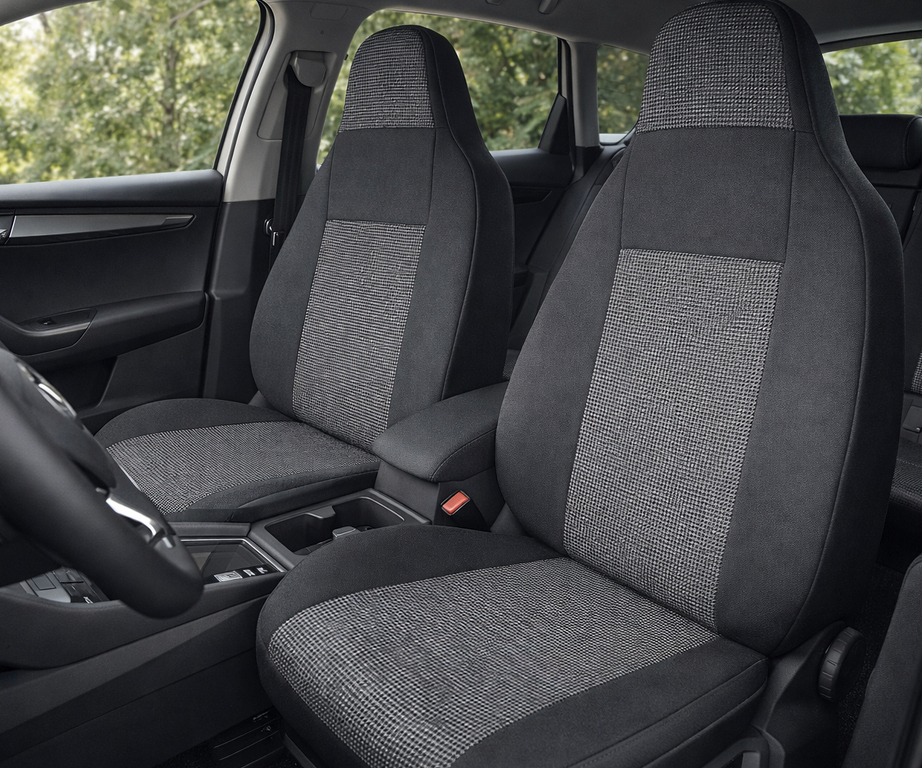 Díky měkkému molitanu na vnitřní straně potahy nekloužou po sedadle. Středové části jsou vyrobeny z odolné textilie (žakárové a polyesterové), boky a zadní části z elastického polyesteru pro lepší přizpůsobení tvaru sedadla.