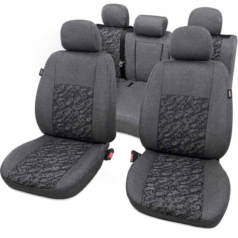 Univerzální autopotahy, sada pro 5 sedadel. Tkaná čalounická látka. Pro Škoda Fabia III (2013 – 2020). Kompatibilní s bočními airbagy. Včetně opěrek hlavy. Vyrobeno v ČR.