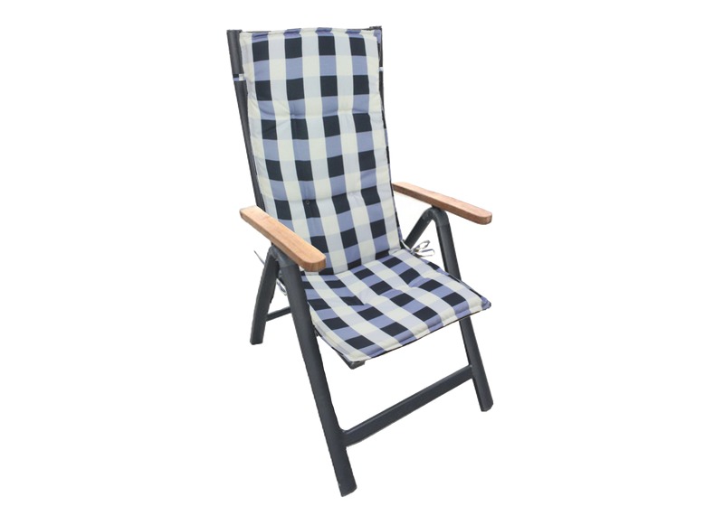 STRIPE high outdoor chair cushion in an elegant design with a decorative hem and ring stitching in the backrest. It is easily attached to the chair with a stretch strap on the backrest and two laces in the bend of the cushion.