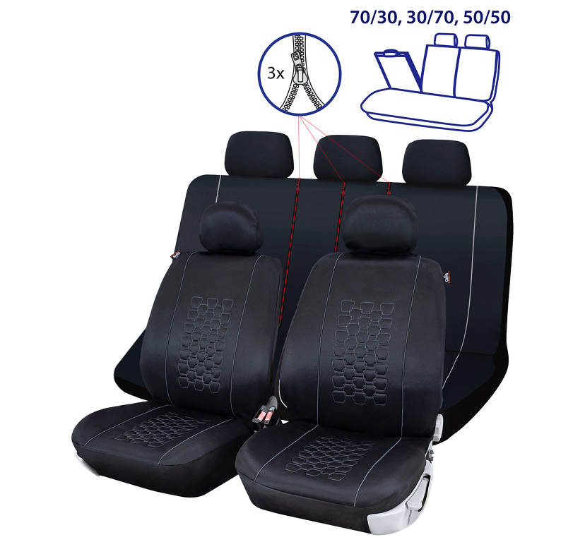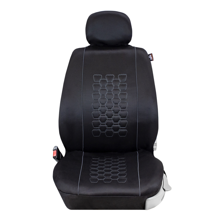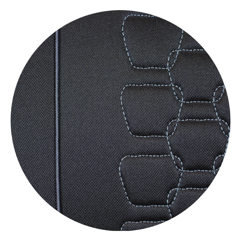 Autopotahy neklouzají po sedadle díky měkkému molitanu na vnitřní straně potahu. Potah je vyroben z elastického materiálu pro lepší padnutí na sedačce. Středy se pyšní dekorativní výšivkou ve tvaru pláství.