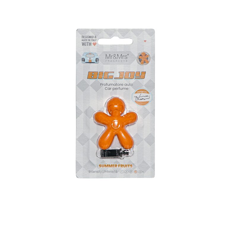 Big Joy je osvěžovač vzduchu do auta, který navrhl Luca Trazzi ve sportovním, popovém a barvitém duchu. Je vyroben z EVA - termoplastického polymeru (měkké pryže) a při kontaktu se vzduchem vypouštěným ventilačním otvorem automobilu uvolňuje příjemnou vůni.