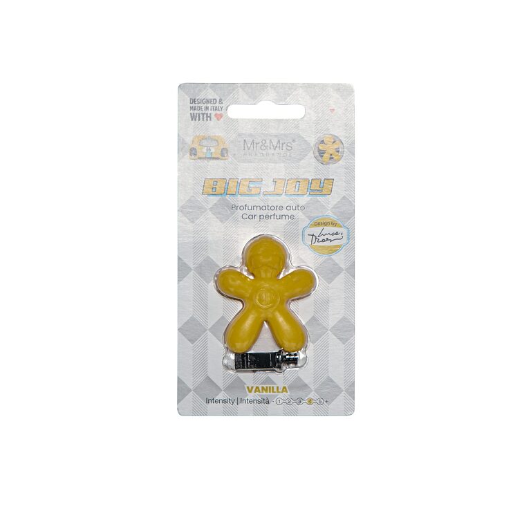 Big Joy je osvěžovač vzduchu do auta, který navrhl Luca Trazzi ve sportovním, popovém a barvitém duchu. Je vyroben z EVA - termoplastického polymeru (měkké pryže) a při kontaktu se vzduchem vypouštěným ventilačním otvorem automobilu uvolňuje příjemnou vůni.