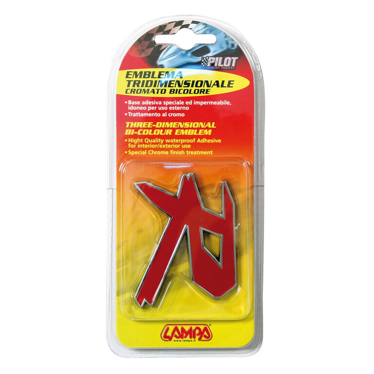 3D emblém s chromovaným vzhledem ve tvaru písmene R v červené barvě.