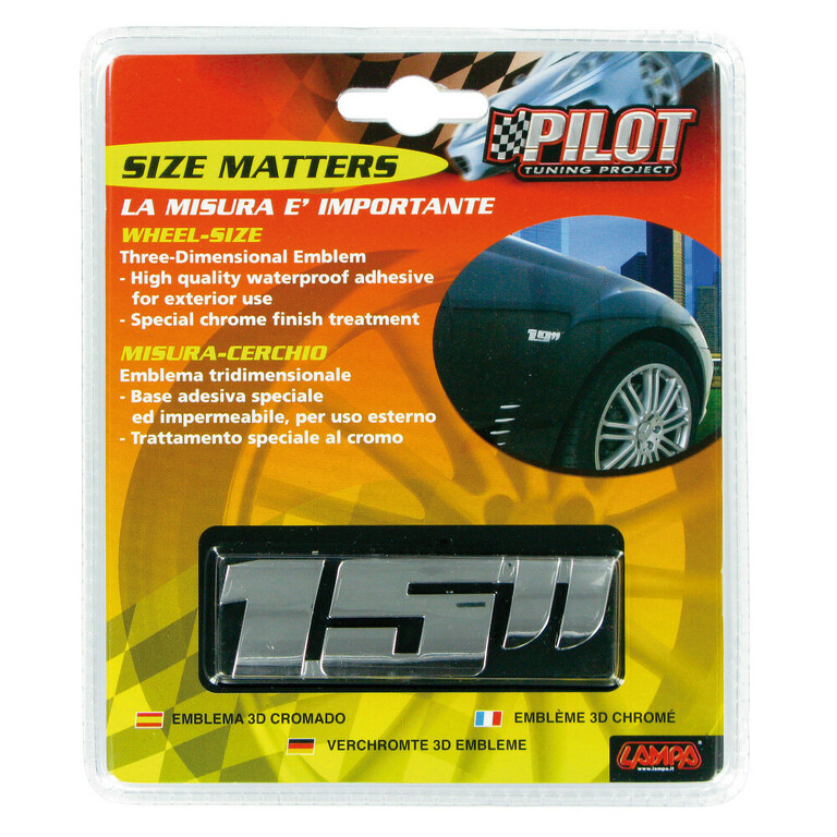 3D emblém s chromovaným vzhledem ve tvaru čísla 15 palců.