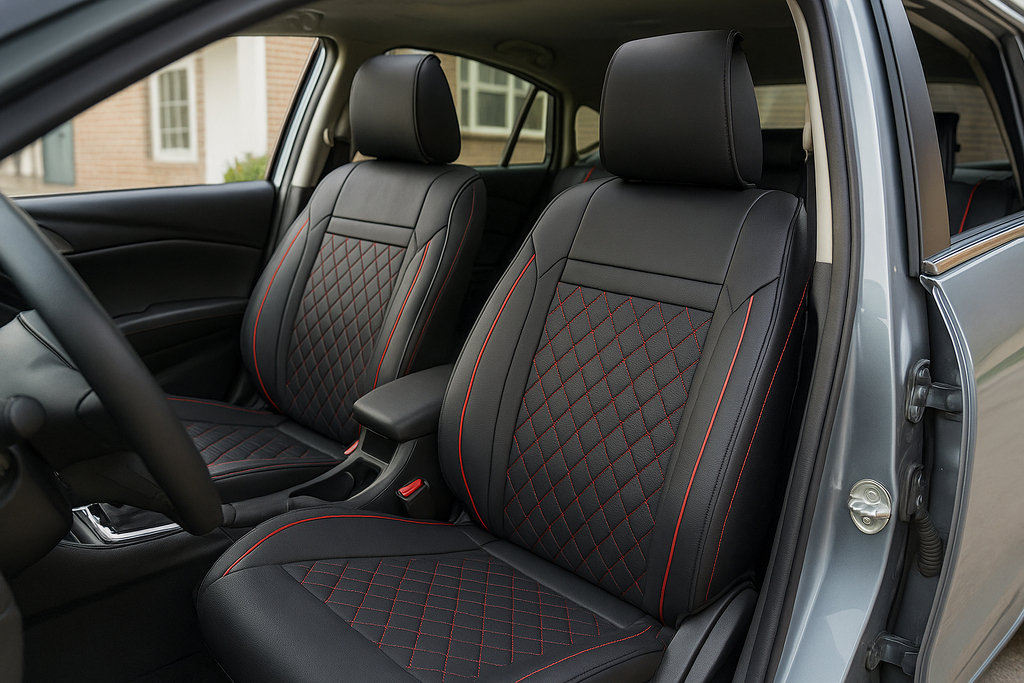 Autopotahy neklouzají po sedadle díky měkkému molitanu na vnitřní straně potahu. Středové části jsou vyrobeny z eko kůže. Boky z elastického polyesteru a záda z eko kůže.