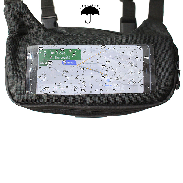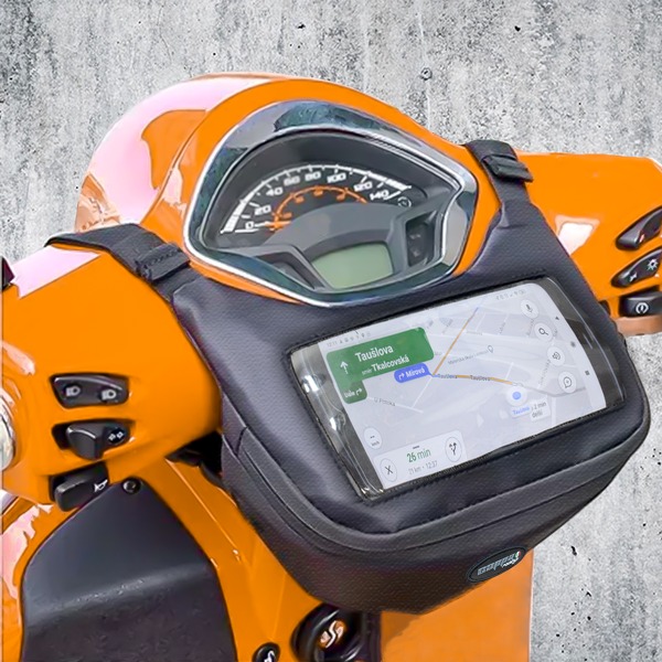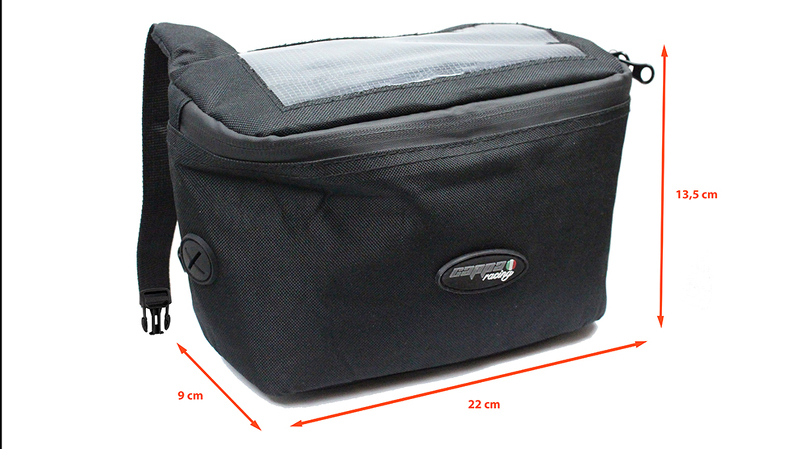 La borsa è dotata di una tasca principale con una capacità di 3,1 litri e di una tasca superiore trasparente per il navigatore o il telefono cellulare. In caso di maltempo, la borsa è dotata di una copertura elastica e impermeabile nella tasca posteriore.