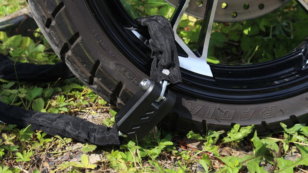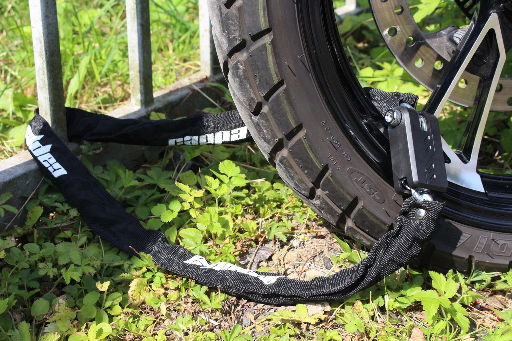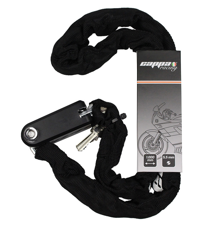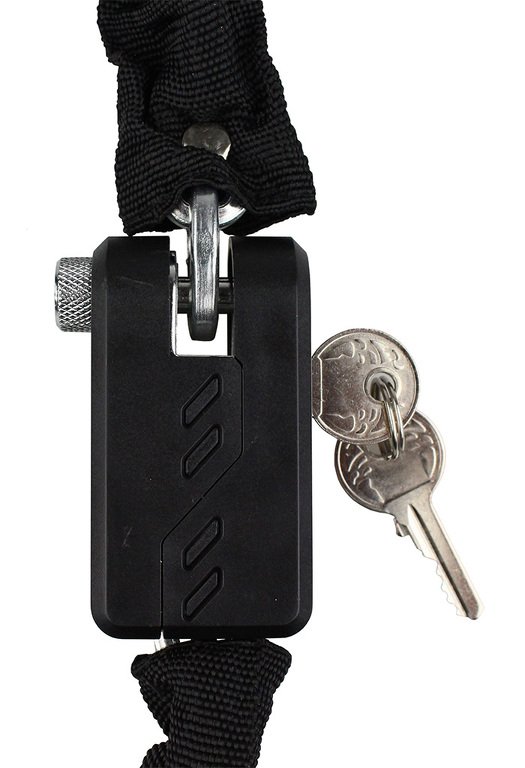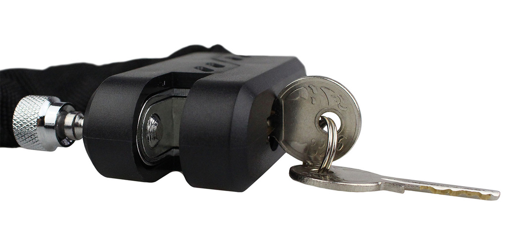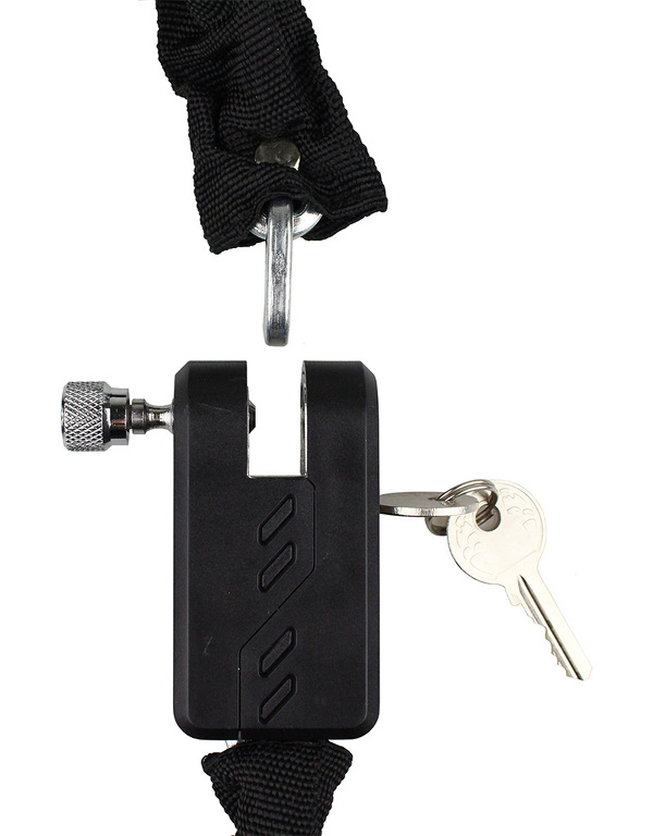 Chiusura con chiave classica. La copertura in tessuto cordura protegge il lucchetto da danni e agenti atmosferici ed evita di graffiare il veicolo o la recinzione durante la chiusura.