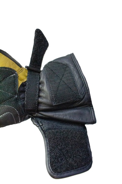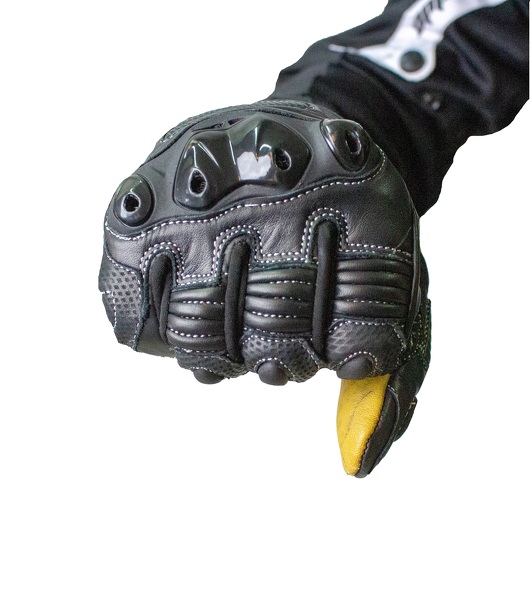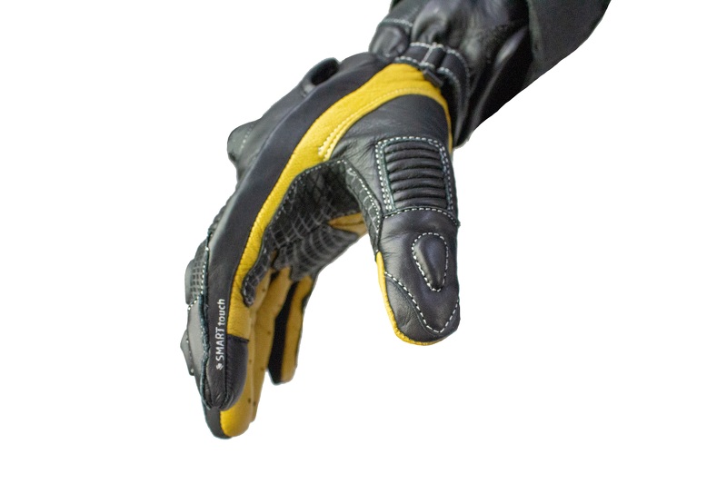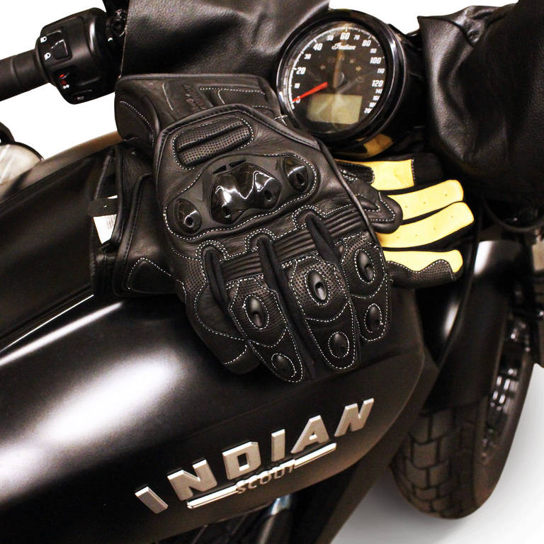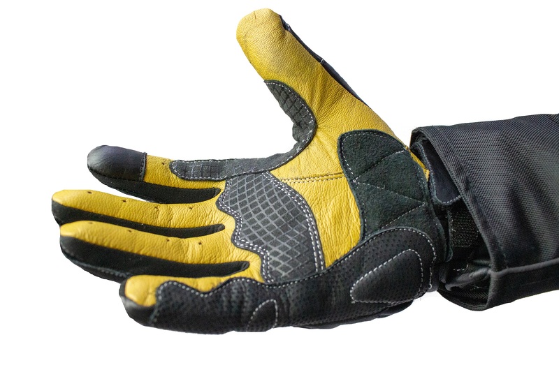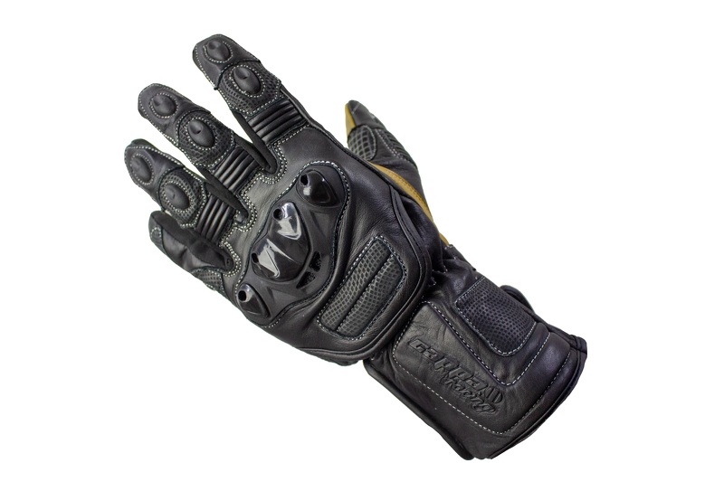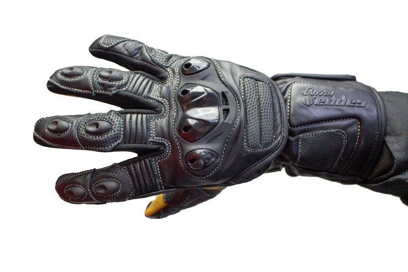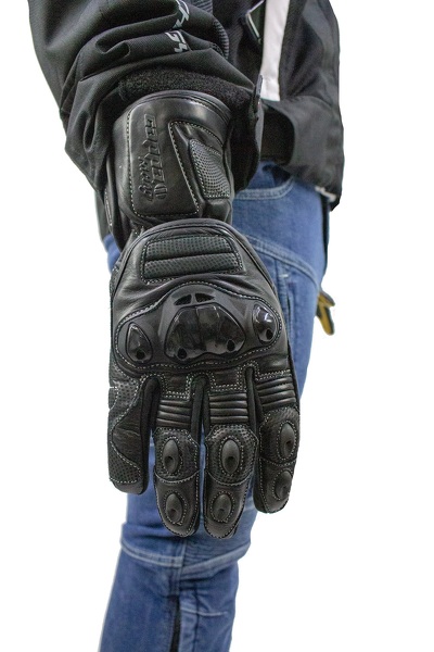 Guanti da moto lunghi SOCHI realizzati in pelle. Con protezioni rigide e morbide e rinforzi sul polso e le dita.