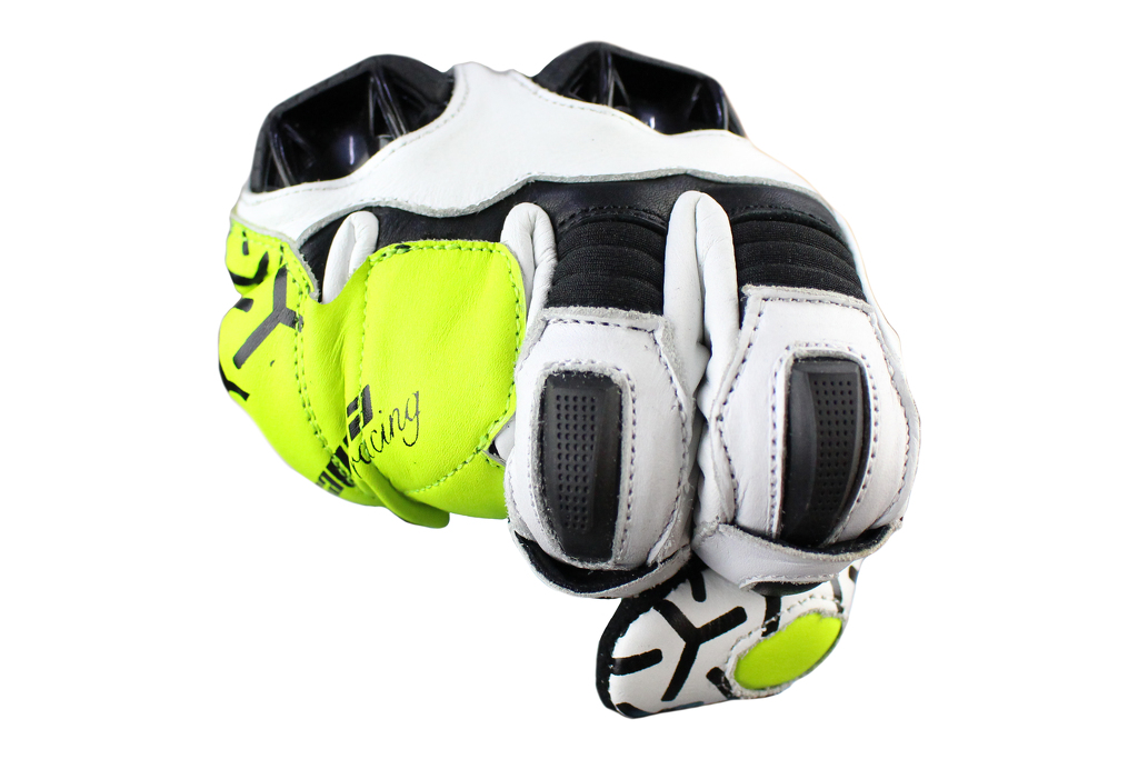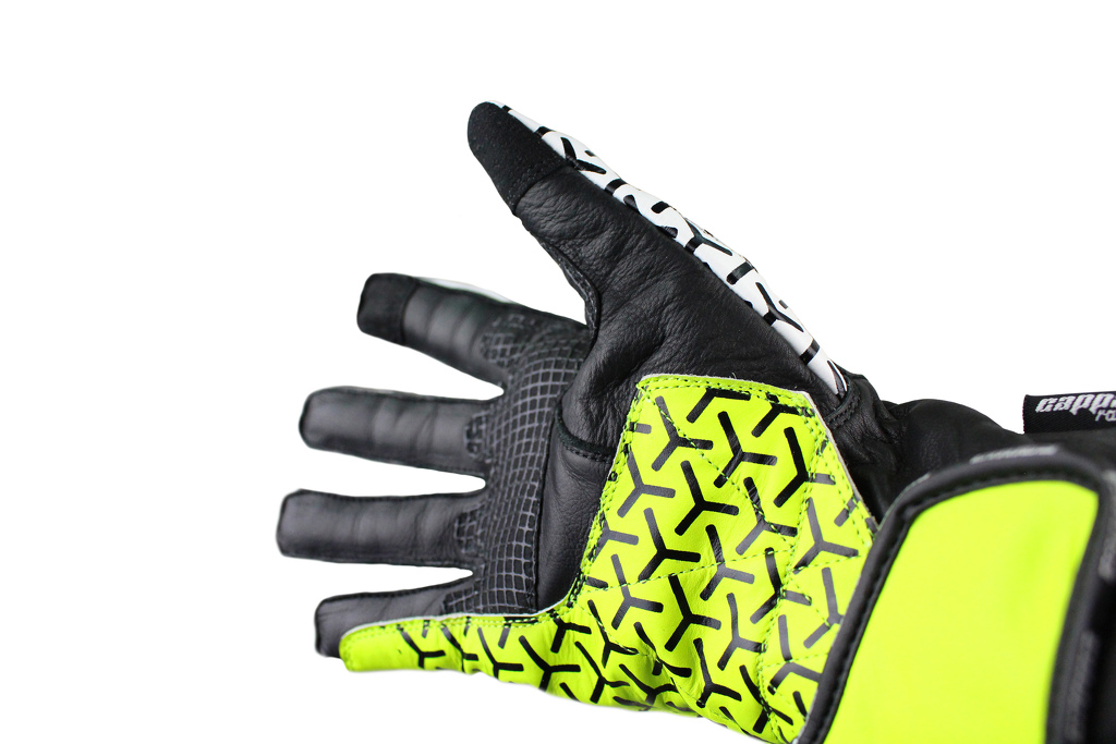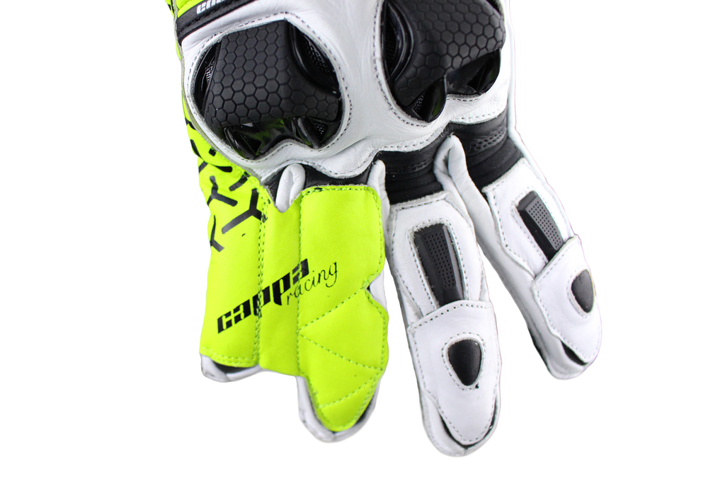 Guanti da moto lunghi TANAKA realizzati in pelle. Con protezioni dure e morbide e con i rinforzi sui polsi e le dita.