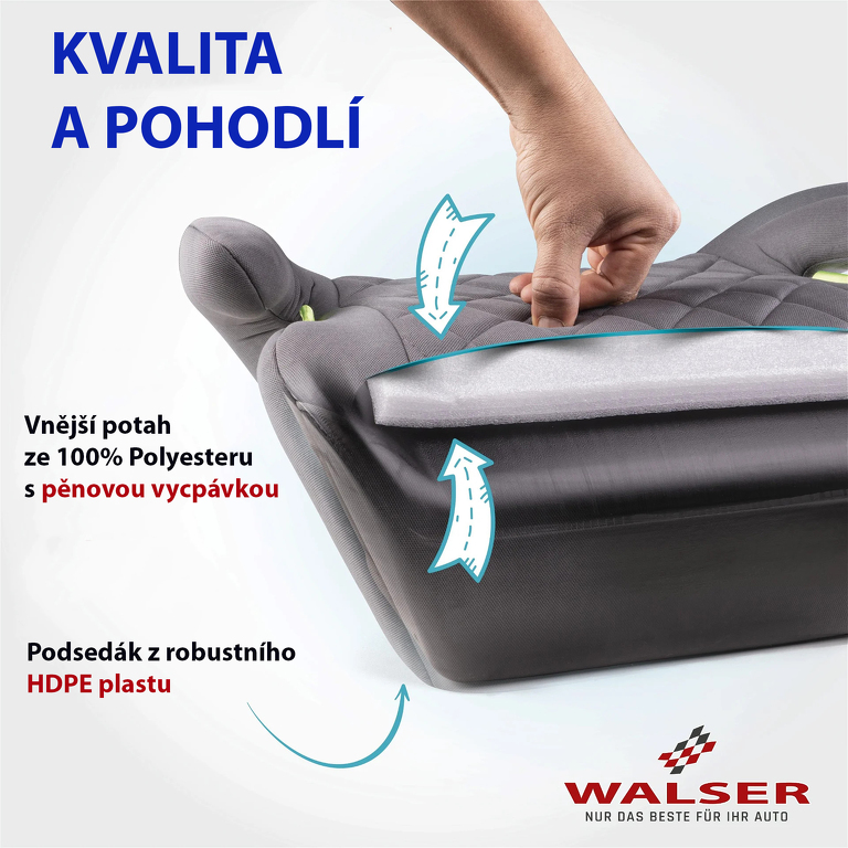 Podsedák ISOFIX do auta pro děti vysoké 125 – 150 cm, bezpečnostní skupina III, homologace ECE R129. Upevnění systémem ISOFIX po směru jízdy, zabezpečení dítěte 3-bodovým pásem automobilu. Snímatelný a pratelný potah.