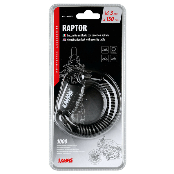 Kombinirana ključavnica RAPTOR je primerna za čelade, motorna kolesa, prenosne računalnike itd. 3-mestno kombinacijsko zaklepanje. Vinilni pokrov ščiti ključavnico pred poškodbami in vremenskimi vplivi, hkrati pa preprečuje praske na vozilu pri zaklepanju. Visoka odpornost na mehanske poškodbe.