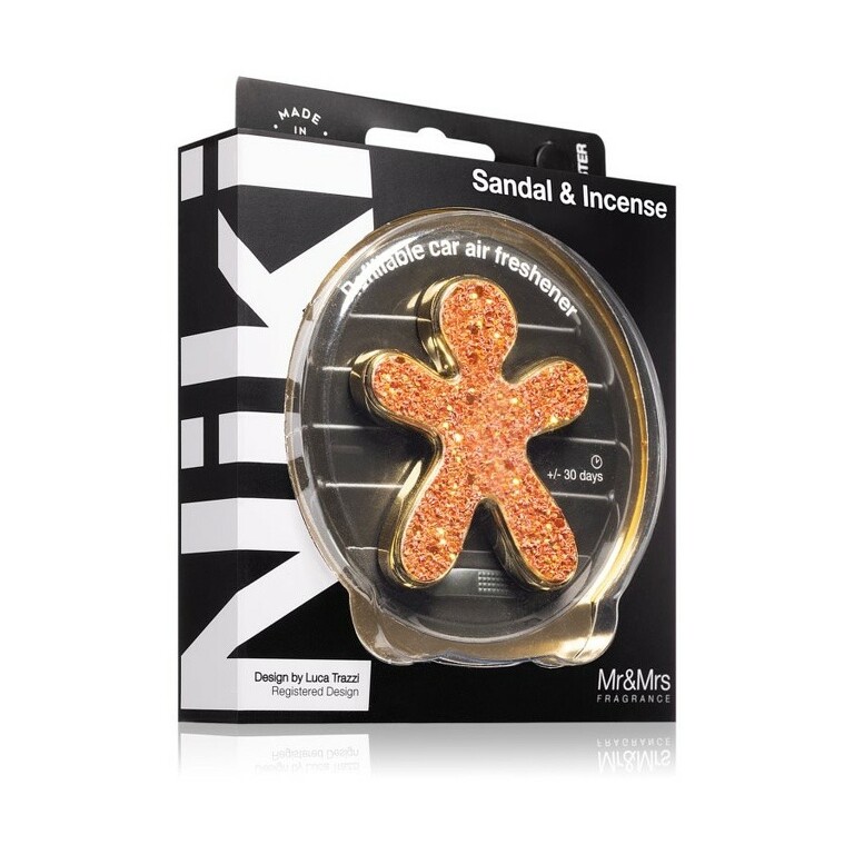Mr & Mrs Fragrance Niki Sandal&Incense je osvežilnik zraka v avtomobilu, ki je rezultat kombinacije elegantnega sloga in dišave.