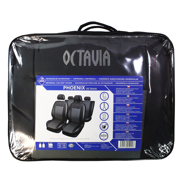 Avtomobilski sedežni prevleki PHOENIX OCTAVIA sta izdelani in certificirani za uporabo na avtomobilskih sedežih s stranskimi zračnimi blazinami. Na strani prevleke je posebej všita odprtina za primer sprožitve zračnih blazin.
