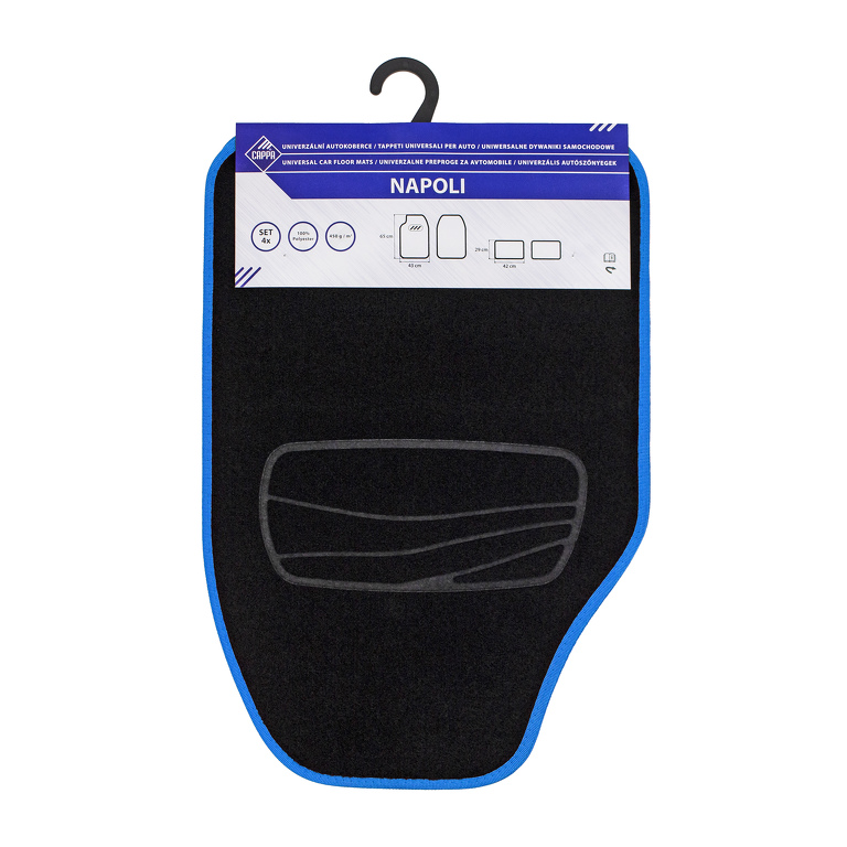 Univerzalne tekstilne avtomobilske preproge NAPOLI v rdeči barvi. Preproge so dobavljene v paketu 4 kosov in so primerne za večino osebnih avtomobilov.